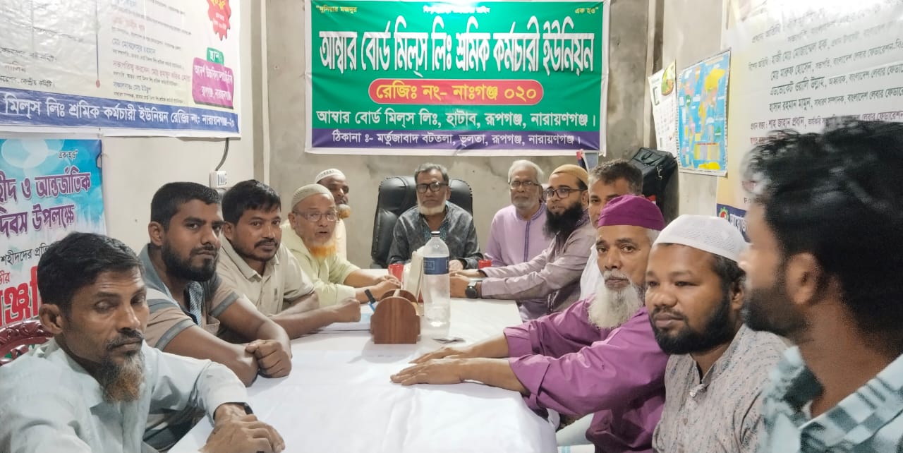 অদ্য ১৪/১১/২০৫ইং রোজ শুক্রবার বিকাল ৫ ঘটিকায়, আম্বার বোর্ড মিলস শ্রমিক কর্মচারী ইউনিয়ন কার্যালয়ে ইউইয়নের সভাপতি মোঃ হুমায়ূন কবির মোল্লার সভাপতিত্বে বাংলাদেশ লেবার ফেডারেশন নারায়ণগঞ্জ জেলার নেতৃবৃন্দের সহিত মত বিনিময় সভা অনুষ্ঠিত হয়। বাংলাদেশ লেবার ফেডারেশন নারায়ণগঞ্জ জেলা সভাপতি এডভোকেট মোঃ শিরাজুল ইসলাম মিয়াঁ, কার্যকরি সভাপতি শাহজাহান প্রধান, সাধারণ সম্পাদক আবু সুফিয়ান, ইউনিয়নের সাধারণ সম্পাদক মোঃ ইউছুপ, সহ-সভাপতি মোখলেসুর রহমান সহ কার্যকরি কমিটির নেতৃবৃন্দ উপস্থিত ছিলেন।